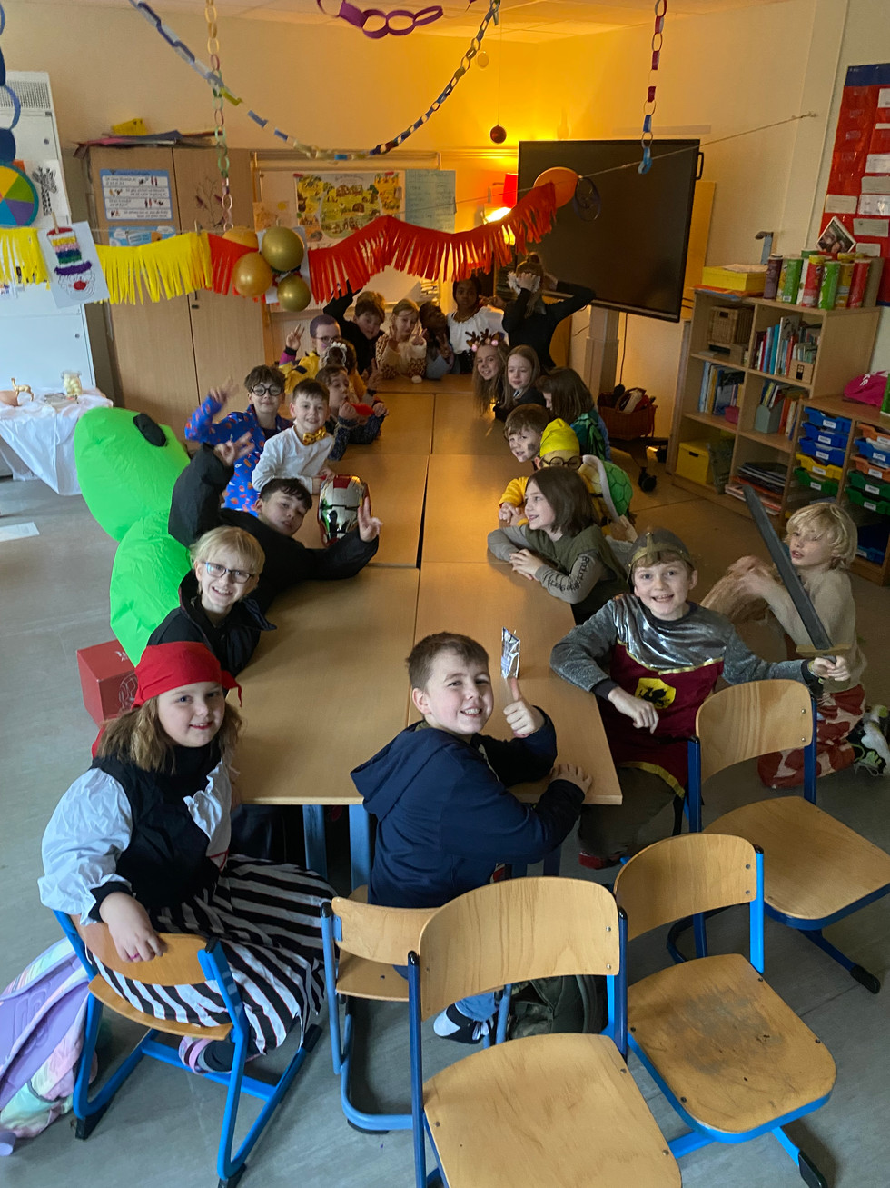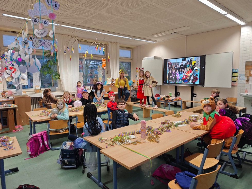 Die Karnevalsfeier fand zunächst in den Klassenräumen statt. Dort wurde gemeinsam gelacht, gespielt, gebastelt, getanzt und Kostüme präsentiert. Ein besonderes Highlight war das buntsüße Karnevalsbuffet, das mit vielen leckeren Snacks gefüllt war. Außerdem kam jede Klasse für eine Stunde in die Turnhalle. Hier warteten der "Sportinator" und ein "Hai" mit einem kunterbunten Programm auf die Kinder. Neben vielen verschiedenen Spielen wurde auch eine Kostümschau veranstaltet. Mit viel Bewegung und Spaß verging die Zeit wie im Flug.